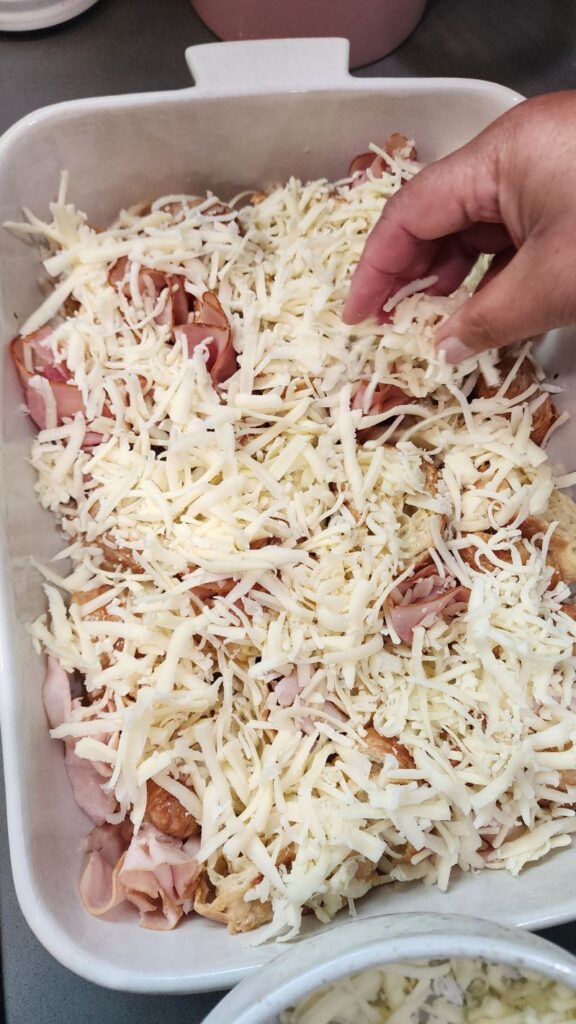 Start by tearing or slicing your croissants into large chunks and placing them into a greased baking dish. Layer in the ham and cheese so every bite gets a little bit of everything.